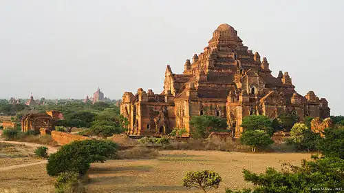 πPyathadar Hpaya(Pyathatgyi)(between the main roads, along the road past Sulamani).Large hallways and a beautiful large terrace. The Buddha can be seen from the top of the terrace through the outer access hallway also. In wet season, the road can be very bad, meaning that tour groups are generally absent and the temple can be quite peaceful. If you get here in the morning hours, the terrace view is very much worth the mud-trail ride. Offers quite a view of Old Bagan overall. If you come in the pre-rainy season (MayβJune), you can also watch the beautiful sight of farmers tilling the untilled land in preparation for sowing, with a flock of crows following. This temple is being restored with the help of Singapore.