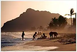 Bahia de Kino's sandy beach is one of the town's attractions. The beach is easily accessed every block via public access ways. To the south of town is the Santa Cruz estuary/lagoon then the coastline veers to the west to Punta San Nicolas. To the north west of town the coast is an interesting mix of rocky headlands and sand/gravel coves. Views of Isla Tiburon to the west abound. Interesting peaks with magnificent views all the way across to Baja dominate the landscape to the east and north. To the south flat desert scrubland continues all the way southeast to Estero Tastiota about 64 km (40 miles) away.