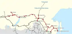 • Tynda at the junction with the partially complete Amur-Yakutsk Mainline (and the Yakutsk "highway"), which will eventually lead to far-flung Yakutsk, and the Little BAM branch south to the Trans-Siberian Railway (2364).