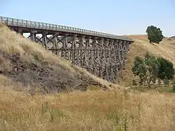 - 🌍 Scarsdale to Linton (12.9). This is the prettiest part of the trip, but also the hardest work. Just out of Scarsdale you will cross the 🌍 Nimmons Rail Bridge, a spectacular wooden trestle bridge, which has been restore so you can cycle over it, or use the track under it. After the bridge the track ascends through bushland, to an abandoned road bridge in the cutting, then you are rewarded with a cruise down through bushland and beside lakes and dams to Linton. Linton has a general store, milk bar, and petrol station for drinks and supplies right on the trail. If you ascend the hill into the town centre, you will find the pub, and not much else. Most of the rest of the town has all closed up.