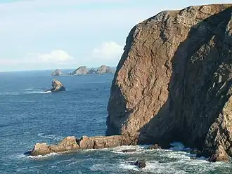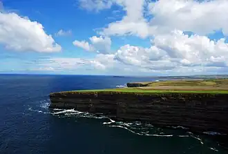 - π Downpatrick Head is the rugged headland further north, with Dun Briste the chunky offshore sea-stack. There's also a church founded by St Patrick, and Pul Na Sean Tinne a collapsed sea cavern which in rough weather becomes a large blowhole. To aircrew the headland is better known as "Eire 64" for the aviation marker - one of 83 etched around the Republic's coast, this one has been preserved.