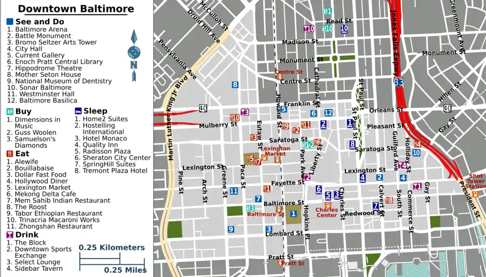 Sadly, Downtown is one of those parts of Baltimore that is not safe by any standards. Sandwiched between pleasant Midtown and the tourist hub of the Inner Harbor, housing the principal businesses in the city and a major university, this should not be the case, but it's Baltimore, folks. Don't run in fear and cowardiceβdefinitely check out Lexington Market, see Poe's Grave, attend a performance at the Hippodrome, or a game at the Baltimore Arena, and bring your family, but be safe. Minimize walking, avoid lonely streets, and park in a well lit area, with no valuables (or really anything) visible.