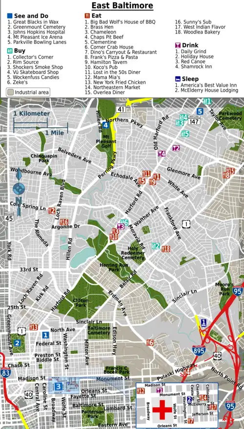 East Baltimore is a sparsely populated, mostly residential district covering about a third of the entire city in the very rough east of downtown and the more suburban-feeling northeast.