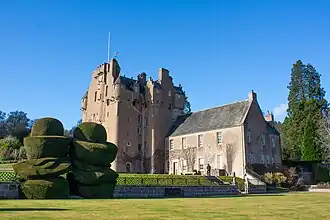 - 🌍 Crathes Castle, Crathes Estate, Banchory AB31 5QJ (3 miles east of Banchory), ☏ +44 844 493 2166, crathes@nts.org.uk. Apr-Oct: daily 10:30AM-5PM; Nov-Mar: Sa Su 11AM-4PM. Attractive 16th-century castle with turretted tower, thick walls and ivy growing up the cream walls. Extensive garden with carved yew hedges and colourful borders. You can also hike trails in the large estate. Adult £13, concs £9.50, NTS/NT free.