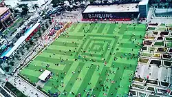 The Alun-alun as seen from one of the Grand Mosque's minarets.🌍Alun-alun.The alun-alun is the large central open lawn square, as most Indonesian cities, towns, and villages have. Bandung's alun-alun is just west of the Kilometre Zero, on the southside of the Jalan Asia Afrika. Bandung's alun-alun has been renovated in 2015 using synthetic grass, and it is a popular place for locals to get together. Hawkers sell many types of snacks and toys for children. There is an underground parking garage below the square. On the northern side (Jl. Asia Africa), most days there'll be some youngsters hanging out dressed up in fancy costumes (cosplay) that are happy for a donation when you take pictures with them.(updated Dec 2016)