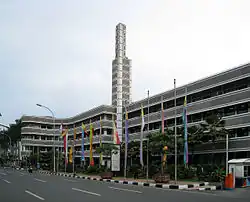 🌍DENIS Bank Building(Headquarters Bank BJB),Jl. Naripan No. 12-14(at the corner with Jl. Braga).The headquarter of De Eerste Nederlandsch-Indische Spaarkas ('The First Dutch East Indies Savings Bank', DENIS) was built in 1935 to a design by Dutch architect A.F. Aalbers in art-deco style, with a horizontal side with smooth curves, and a lift tower that is higher than the six floors of the rest of the building. The design was much appreciated, and therefore Aalbers also received the contract to design the new Savoy Homann hotel building. After Indonesian independence, DENIS Bank was nationalised, and nowadays the building is the headquarters of the BJB Bank (the regional bank for Western Java).(updated Dec 2016)