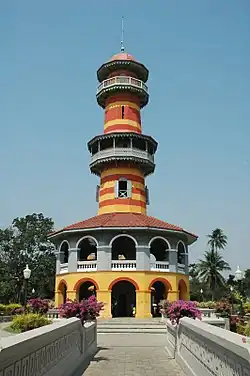 - 🌍 Bang Pa-In Palace (Summer Palace). Daily 08:00-16:00. Bang Pa-In's number one sight. It was built by Ayutthayan King Prasat Thong in 1632 but abandoned after the sack of Ayutthaya in 1767. The site was partially restored by King Mongkut (Rama IV) in the 1850s. The site as it stands today, however, is largely the work of King Chulalongkorn (Rama V). For 17 years from 1872, the grounds were expanded and the more traditional Thai architecture was complemented with buildings in a variety of styles—mainly European but also Chinese. Last restored in 2001, the palace and its immaculate grounds are well worth a visit. The grounds are not too large to be covered on foot, but you can also rent a golf cart to scoot around in for 400 baht for the first hour and 100 baht per hour after that. As at all royal sites, proper dress is required, but you can buy a 100 baht wraparound skirt from the stall in front of the entrance if needed. 100 baht.