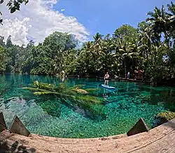 - 🌍 Paisu Pok Lake (Through the wooden decorative gate in Luk Panenteng village). Accessible 24/7, best in the morning before local tourists arrive. Likely the reason why you heard about Banggai in the first place. A lake famed on social media for its lush setting surrounded by palm trees and especially its extremely transparent water. Rental of gazebos (30,000 rupiah), stand-up paddles (100,000), boats (30,000), snorkelling equipment and even drones and experienced underwater photographers are available, to make sure influencers can get the best footage for their channels. 5,000 rupiah entrance fee, late afternoon the fee is not collected anymore.