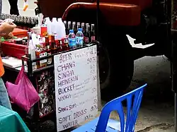 - 🌍 Suksabai (สุขสบาย เรสเทอรองด์), 96 Rambuttri Rd (opposite Viengtai Hotel), ☏ +66 2 629-0298. 24 hours. Suksabai is touted as a restaurant, and they have a large menu with Thai, grill and Italian dishes in the 80-130 baht price range. While decent for budget travellers, the real attraction of this place is its outdoors seating. Seats are lined up onto the main road every night, which makes it is a good place to hang out, talk and watch football on the big screens. Beer and cocktails here are slightly cheaper than on Khao San Road; a large Chang beer goes for 80 baht. It's best to only go inside for the toilet, as its interior is rather uninspiring and messy.