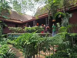 - 🌍 Jim Thompson's House (พิพิธภัณฑ์จิม ทอมป์สัน), 6 Soi Kasemsan 2 (BTS National Stadium), ☏ +66 2 216-7368. 09:00-17:00 daily. The infamous CIA operative Jim Thompson revived the Thai silk industry after World War II and had this house assembled from six traditional Thai-style houses. You must take the guided tour through the buildings, which are given in plenty of foreign languages. Get there early to beat the heat – you may have to wait a half hour or so in the courtyard before a tour starts (not a maximum of 20 minutes as claimed). There are one seasonal opening cafe named Jim's Terrace, one restaurant named Swensen's and one shop selling silk products alongside. 200 baht, 100 baht if under 25 years of age.