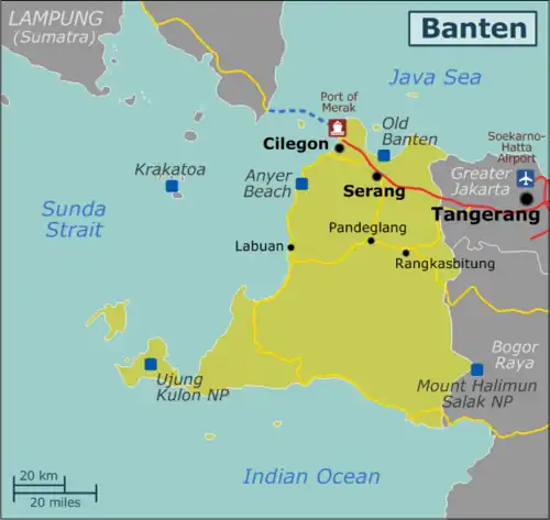 Banten is the westernmost part of the island of Java in Indonesia. This article covers most of Banten province, but the northeastern parts of the province are suburbs of the Indonesian capital, and are covered in the article on Greater Jakarta.