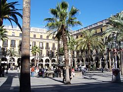 • 🌍 Plaça Reial (next to La Rambla). This square is famous for the nightlife and the uniform architecture, and features fountains and palm trees. It was built during the 19th century on the site of a monastery, after the Mendizábal law expelled the monks. After some years Antoni Gaudí designed the streetlights which are still there. It has lots of activity during the day, thanks to the many terraces of the bars and restaurants. OSM directions target=_blank