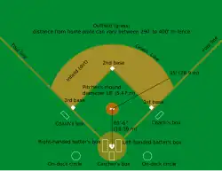 The most noticeable difference is that softball uses an underarm pitch, in contrast to the overarm pitch that is used in baseball. In slow-pitch, the pitch is required to be lobbed toward home plate, with the minimum arc (and usually the maximum arc) regulated. Fast-pitch has no restrictions on the arc of the pitch. Softball also typically uses a larger ball and thinner bat than baseball, and also has a smaller field, with the distance between the bases being 60 feet and the pitcher starting her delivery 43 feet from the rear of home plate, in contrast to baseball's 90 feet between the bases and 60 feet, 6 inch pitching distance. Also, softball pitchers do not work from a raised mound as baseball pitchers do; the pitching circle is at the same level as the rest of the infield. (This may vary in recreational leagues that use baseball fields.) Softball games are also usually shorter, with only seven innings being played, in contrast to nine in baseball.