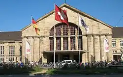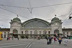 The trains into Germany also call at 🌍 Basel Badischer Bahnhof (abbreviated Basel Bad Bf), north of the river in Kleinbasel. However some regional trains to southern Germany start from Basel Bad and don't call at Basel SBB: these hug the border as far as Schaffhausen then follow the Danube to Ravensburg and Ulm.