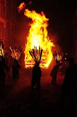 - Chienbäse. Combine Fasnacht with the amazing fire spectacle of Chienbäse parade in nearby town of Liestal, capital of the neighboring canton Basel-Landschaft (15 minutes by train from the SBB Station), which starts at 19:15 on the Sunday evening preceding Morgestraich. Locals clad in (kind of) fireproof garb parade through the narrow and spectator-lined streets of the town, carrying large burning wooden brooms (bäse) above their heads. Other groups are drawing iron carts with huge bonfires - which they even rush through some of the old town gates, as the flames lick the structures above. There are a number of inconclusive interpretations of this pagan-seeming custom but, again, you don't necessarily need to understand any of them to appreciate the eerie and even mildly threatening beauty of the parade.