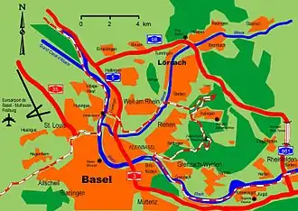 The airport lies in France, 4 km northwest of Basel - it's connected to the city and to Switzerland by a customs-free road. On arrival you either go through Swiss or French passport control and customs, into a small hall where you rejoin the people who went the other way. To reach the city: