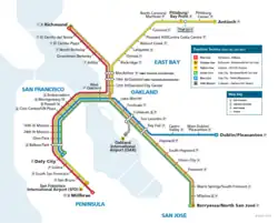 BART is a metro-regional rail hybrid which connects San Francisco, the East Bay cities, northern San Mateo county, and northeastern San Jose, with five lines as well as spur services to Oakland Airport and the city of Antioch. Four of the five lines serve San Francisco, while a fifth, the Orange line, connects the northern San Jose neighborhood of Berryessa to the city of Richmond through Fremont, Oakland, and Berkeley. Two of the San Francisco lines, the Blue and Green lines, start in Daly City, with both lines running concurrently through the Mission, Downtown San Francisco, Oakland, and the southern parts of the East Bay. The Blue line separates from the Green Line at Bay Fair station to serve Castro Valley and eventually terminating at Dublin Pleasanton, while the Green line runs concurrently with the Orange line to Berryessa. The other two San Francisco lines, the Yellow and Red lines, each begin further south at San Francisco International Airport (SFO); the Red line temporarily turns further south to Millbrae and a connection to Caltrain before rejoining the Yellow line at San Bruno station, to which the Yellow line runs directly to from SFO. The two lines serve South San Francisco and Colma before running concurrently with the Blue and Green lines between Daly City and West Oakland; the Yellow and Red lines serve downtown Oakland's 12th and 19th streets as opposed to the Blue and Green serving Lake Merritt and the neighborhood of Fruitvale. The two lines diverge after MacArthur station; the Red line travels concurrently with the Orange line to Richmond via Berkeley, while the Yellow line continues on its own to Pittsburg and Bay Point through Concord and Walnut Creek. Through a spur line known as eBART, travelers on the Yellow line can travel as far as Antioch.