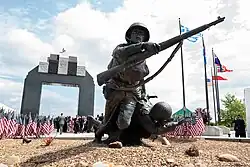 The statues of the National D-Day Memorial are surrounded by a fountain and the waving flags of the Allies in World War II.🌍National D-Day Memorial,3 Overlord Circle(5- to 10-minute drive or 30-minute walk to town center; 30- to 40-minute drive to Lynchburg and Roanoke.),☏ +1 540 586-3329.Open everyday, 10AM to 5PM.The National D-Day Memorial is the official national D-Day war memorial, opened on June 6, 2001 with then-president George W. Bush present alongside 15,000 other people. It states that the memorial's purpose is "In Tribute to the valor, fidelity and sacrifice of Allied Forces on D-Day, June 6, 1944", honoring the 4,414 Allied soldiers who died in the invasion out of 150,000 servicemen from 12 countries. Overlord Arch is the signature feature of the monument with flags of the Allies overlooking incredibly detailed sculptures of soldiers in a pond. Many times through the year, events ranging from reenactments of the war to a religious mass are held throughout the year.(updated Feb 2020)
