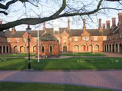 Among the most notable buildings in Bedworth are the Nicholas Chamberlaine Almshouses on All Saints' Square in the town centre, which are built in Tudor style and date from 1840. They replaced the original buildings which had been funded by a legacy from the local benefactor Nicholas Chamberlaine (1632–1715) through his will. The almshouses were restored in the 1980s, and are now Grade II* listed.