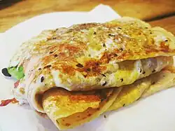 Savory pancakes (煎饼果子 Jiānbĭng guŏzi) are one of the most popular street snacks, eaten from morning till night with most carts operating during the morning commute and then opening again at night for the after-club crowds and night-owls. This delicious pancake is cooked with an egg on a griddle, a fried dough crisp is added, and the whole thing is drizzled in scallions and a savory sauce. Hot sauce is optional. Diehard fans often go on a quest for the best cart in the city. Lamb kebabs (羊肉串儿 yángròu chuànr) and other kebabs are grilled on makeshift stands all around Beijing, from the late afternoon to late at night. A winter speciality, candied haw berries (冰糖葫芦 bīngtáng húlu) are dipped in molten sugar which is left to harden in the cold and sold on a stick. You can also find variations with oranges, grapes, strawberries, and bananas, or dipped in crumbled peanuts as well as sugar. This sweet snack can also sometimes be found in the spring and the summer, but the haw berries are often from last season's crop.