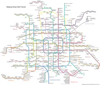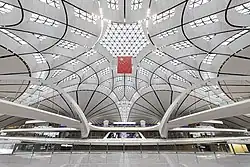- 🌍 Beijing Daxing International Airport (北京大兴国际机场 Běijīng Dàxīng Guójì Jīchǎng, PKX IATA), ☏ +86-010-96158. Shaped like a phoenix—or perhaps a starfish—this airport aims to handle 100 million passengers annually as a major international hub. Designed for efficiency, it features automated check-in with facial recognition, and travelers can walk from security to the farthest gates within eight minutes. The airport is accessible via the Daxing Airport Express, which connects to the Beijing Subway's outer loop line 10 at Caoqiao. Tickets cost ¥35, and machines require ID (non-Chinese passports are not accepted), so purchasing a ticket from a human cashier is the easiest option for new arrivals. The Beijing–Xiong'an high-speed intercity railway links Daxing Airport to Beijing West Railway Station, which offers additional subway connections and serves as a gateway to the high-speed rail network. By the end of 2024, the Huairou–Daxing Airport intercity railway will open, providing another high-speed rail connection, eventually extending to Capital Airport.