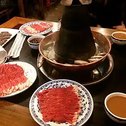 Beijing is also known for its mutton hotpot (涮羊肉 shuàn yáng ròu), which originally came from the Manchu people and emphasizes mutton over other meats. Like variations of hotpot (general name 火锅 huŏ guō) from elsewhere in China and Japan, hotpot is a cook-it-yourself affair in a steaming pot in the center of the table. Unlike Sichuan hotpot, mutton hotpot features a savory, non-spicy broth. If that's not exciting enough for you, you can also request a spicy broth (one that is flaming red, filled with peppers, and not for the weak!) To play it safe and satisfy everyone, you can request a yuan-yang (鸳鸯 yuānyáng) pot divided down the middle, with spicy broth on one side and regular broth on the other. Raw ingredients are purchased by the plate, including other types of meat and seafood, vegetables, mushrooms, noodles, and tofu, so it's also perfectly possible to have vegetarian hotpot. A dipping sauce, usually sesame, is served as well; you can add chilis, garlic, cilantro, etc., to customize your own sauce. While "raw" sounds dangerous, boiling the meat yourself is the best way to ensure that more risky meats like pork are fully cooked and free of germs.