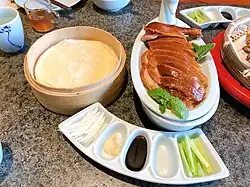 Peking duck (北京烤鸭 Bĕijīng kăoyā) is a famous Beijing speciality served at many restaurants, but there are quite a few restaurants dedicated to the art of roasting the perfect duck. Peking duck is served with thin pancakes, plum sauce (甜面酱 tiánmiàn jiàng), and slivers of scallions and cucumbers. You dip the duck in the sauce and roll it up in the pancake with a few slivers of scallions and/or cucumbers. The end result is a mouthwatering combination of the cool crunchiness of the cucumber, the sharpness of the scallions, and the rich flavours of the duck.The two best known restaurants are Dadong or Quanjude.