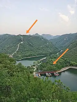 - Xiangshui Lake, Dazhenyu Village, Bohai Township. The hiking trail is a circuit and goes past partially restored segments of the Great Wall. There is a break in the Great Wall for what was once the Moshikou Pass, which was a strategic gateway. The pass was replaced by a dam constructed in the 1970s. A highlight of the Xiangshui Lake section is a segment of the wall running along a ridge that leads to the top of a cliff overlooking the gap that was the Moshikou Pass. Appropriately the segment is called the Lianyunling Great Wall, meaning “a ridge linked to the sky". It's not possible to climb the wall to the peak but from below the remnants of the wall structure looks like a shadowy mountain hideout. The underwhelming Xiangshui Lake Great Wall Plum Blossom Exhibition in early spring draws big crowds.