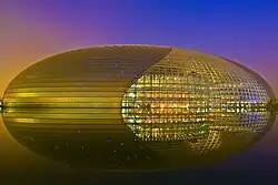 - 🌍 National Centre for the Performing Arts (国家大剧院 Guójiā Dàjùyuàn), 2 West Chang'an St (西长安街2号 Xīcháng'ān Jiē) (West of the northern end of Tian'anmen Square), ☏ +86 10 6606 4707, +86 10 6655 0987, fax: +86 10 6655 0988, webmaster@chinanationalcentre.org. Theater complex with three halls (opera, music and theater) covering almost 12,000 m² and seating a total of 5,452 people. One of the most stunning buildings in Beijing and a must see even if not attending an opera or concert.
