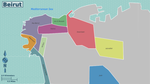 | Downtown In the heart of the city beside the Beirut port and Beirut marina; includes many cafés, restaurants, and places to shop. Also home to many historical sites. It is very touristy, and not as authentic as other districts. |