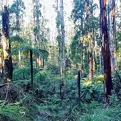 - π Sherbrooke Forest (1 km out of Belgrave on the Monbulk Road). A unique and ecologically valuable example of a sub-tropical rain forest. The flora and fauna are broad and varied; the forest of great white Victorian mountain ash and giant tree ferns. If you walk quietly, especially around dawn you may hear, and even glimpse, the male Lyrebird's dance. Be sure to include Sherbrooke Falls on your walk through this tranquil forest.