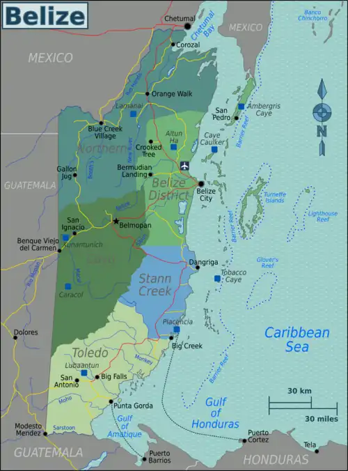| Stann Creek Coastal region south of Belize District, access to quiet reef islands and boats to and from Honduras. |