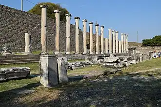- 🌍 Acropolis, Akropol Cd (See "Get around"), ☏ +90 444 6893. Daily 08:30–17:30. This extensive site is the main reason to visit Bergama and will take a couple of hours to explore. The only ticket sales point and entrance is at the top by the cable car station; accordingly the sights are described here north to south. Most date to 2nd century BC, when an ancient higgledy-piggledy settlement was beautified by Eumenes II and Attalus II to try to outshine Athens. The Arsenal at the north tip of the site is scrappy and you only go that far for the views. The Altar to Zeus measures some 35 x 33 m and may have been the "Satan's seat" that St John raged against in Revelation. It was decorated by an ornamental frieze depicting the war between the giants and the Olympian gods. In the 19th century thousands of frieze fragments were re-assembled in the Pergamon Museum of Berlin: what's here is a replica, and naturally there's a campaign to reclaim the original. South of the altar is the upper agora or market place, and the sparse remains of a temple to Dionysus. The structures near the entrance gate are Heroons (tombs of heroes), the stumps of a propylon (monumental gate) and the low-lying remnants of the Temple of Athena. That temple's north side is the likeliest site of the Library of Pergamon, which held 200,000 scrolls, and sought to rival the Great Library of Alexandria. The scrolls were on parchment, forerunner to paper, much easier to handle than papyrus and breaking the Egyptian grip on that product (indeed the name "parchment" derives from Pergamon, though it wasn't invented here). The library fell into disuse after the Roman takeover of 133 BC: Antonius gave the contents to Cleopatra as a wedding gift, probably to re-stock her damaged library in Alexandria. The Theatre of Pergamon is a very steeply-raked amphitheatre with seating for 10,000. The terrain was too steep for a permanent orchestra or stage, so a temporary wooden stage was erected for performances. Built in the 3rd century BC, this is the oldest of the city's theatres but the best preserved. The Temple of Trajan just south of the theatre was started by Trajan circa 110 AD and completed by his successor Hadrian. It's been extensively restored, the sort of elegant Corinthian marble columns you depict on banknotes. That concludes the Upper Acropolis, now descend south. Building Z, halfway down the slope, has beautiful mosaics. Lower Acropolis is less preserved and suffers by comparison to what you've already seen: if you drove up, it's time for one of you to re-ascend the site to bring the car round to the lower gate. Down here are the Temple of Demeter and the Temple of Hera. The Gymnasium complex is on three levels, with the boy novices practising at the base and the top jocks showing their moves and muscles on the upper deck. The Gate of Eumenes II is a fortification tower, and the House of Attalos has mosaics. Exit via the gate in the lower agora, to find yourself back near the city centre. 340 TL (about €11).