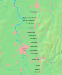 Although the Bergstraße (the road) does not pass through Lorsch and Ladenburg, the Bergstraße website considers them to be part of the Bergstraße region. Both towns are about 5 km from the Bergstraße road.