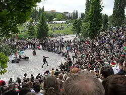 - 🌍 Görlitzer Park (K36). 150-200 m along the Wiener Straße (bypassing the fire house and the public swimming pool) from U-Bahn Görlitzer Bahnhof, the park is famous for the Turkish families barbecuing on summer weekends, failed contemporary art and relaxed atmosphere of students. It does have a reputation of being full of pickpockets and drug dealers though and the police makes regular visits to this place to check on the situation.