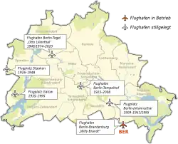 The official name of the airport -Flughafen Berlin Brandenburg Willy Brandt- after Willy Brandt, mayor of West Berlin from 1957 to 1966 and chancellor of West Germany from 1969 to 1974, is virtually only ever used in formal official communication, but it also adorns the main terminal in big letters, similarly to defunct Berlin Tegel Airport Otto Lilienthal.