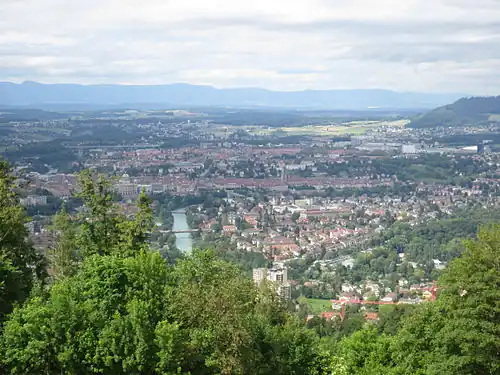 In 2018, it had a population of about 134,000 in the city, and roughly 420,000 in the urban agglomeration. It sits on a peninsula formed by the meandering turns of the river Aare.