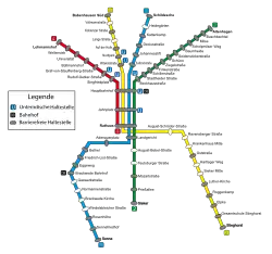 Bielefeld is served by a Stadtbahn which can be classified as a mixture of light rail, tram and metro. (see the network plan on the right). Where the Stadtbahn doesn't go, there is an extensive bus network. With headways as low as ten minutes. As is usual in Germany, tickets for bus and Stadtbahn are integrated with each other and operate on the proof of payment system.