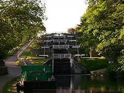 - π Five-Rise Locks (Leeds-Liverpool Canal), Beck Lane, Bingley. The Five-Rise Locks is an impressive, Grade I-listed staircase lock on the Leeds and Liverpool Canal at Bingley, first opened in 1774, and therefore a remarkable relic of the early Industrial and transport revolution in northern England. As the name suggests, a canal boat passing through the hinged gates of the lock is lifted or lowered in five stages. The Five-Rise is notable as the steepest flight of locks in the UK, with a gradient of about 1:5 (a rise of over 59 feet, or 18 metres) over a distance of 320 feet (98 m). The intermediate and bottom gates are also the tallest in the country. The Five-Rise Locks is a major tourist attraction in the Aire Valley and the town of Bingley. Boats that pass through attract a lot of attention, especially at weekends when large crowds may be attracted to watch the locks in operation. Free.