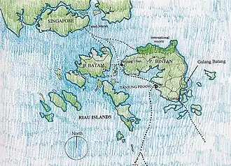 Bintan: the northern tip of the island, Bintan Resorts (Lagoi), 45 minutes from Singapore by ferry, full of expensive resorts and manicured lawns. As it has very little in common with the rest of the island, the resorts are covered in the Bintan Resorts article.