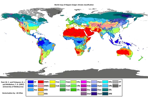 Around the world, there are various biomes with vegetation that depends on the climate patterns of the region. For example, wet regions around the equator are tropical rainforests, and dry regions typically farther from the equator are deserts. There are some basic types of climates as designated by Köppen, found in various regions of the world: