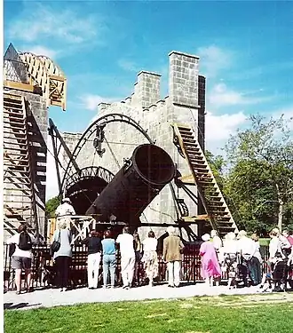 - π Birr Castle, Rosse Row R42 VO27, β +353 57 912 0336, reception@birrcastle.com. Mar-Oct: daily 9AM-6PM. The castle was built from 1620 and "gothicised" in the 19th century. It's the home of the seventh Earl of Rosse, Brendon Parsons (b 1936), and you can't visit within. You come for the grounds and gardens, of which the centrepiece is "The Leviathan of Parsonstown", the great telescope completed in 1845. It's a 72-inch reflector: the third Earl devised methods of grinding a mirror weighing three tons, and it was the world's largest telescope until 1917. It was mounted on an iron arc, giving it a wide range of altitude, but limited azimuth (side-to-side) so objects could only stay in view for an hour. The telescope was used to 1890 then succumbed to disuse, dismantling and dilapidation, but was restored in the 1990s. In 2017 a low-frequency radio telescope was installed in the castle grounds. Adult β¬9.