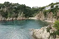- 🌍 S'Aguia cove (Cala S'Aguia) (by a 20-min trail at the left of the pinya de Rosa botanical garden entrance). Small cave with no facilities in the border between Blanes and Lloret del Mar. From the south of the beach, sanded by 1-m diameter rocks you can see the S'Aguia rock, the last rock you will see north of the beach. On the beginning of the trail is a green gate. Pass through the side of the gate only by foot. People visiting the beach usually park in the garden's parking lot. According to a sign, payment may be required, but it usually is not. Free.
