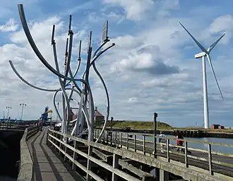 The coal was mined at Cowpen a couple of miles west upriver, separated from Blyth by a tidal creek, until this was land-filled in the 1890s and the settlements merged. Blyth was then a busy, grubby place, building many Royal Navy ships including the first aircraft carrier Ark Royal in 1914. From the 1960s most of its industries collapsed though the port is still active, importing wood pulp for newsprint and metal ores. Blyth is nowadays principally a commuter town for Newcastle.