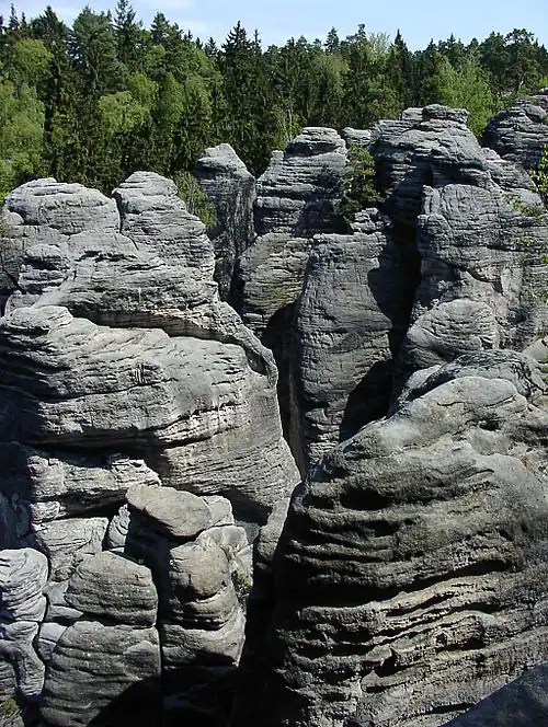 - 🌍 Borecké Rocks. These rocks are on the hill Bor (360 m above sea) 1 km west of the village Rovensko p. Troskami. An elongated hill is bordered with rugged sandstone wall with alcoves, ledges, cavities, and caves. The sandstone rocks of Borek include a number of interesting rock formations, such as blocks, columns, caves and various minor forms of weathering such as honeycombs and ironstones. The upper plateau is covered by pines, whose age is about 120 years. Shallow sandy soils and hard sandstone bedrock caused the vegetation to grow flat tops, slightly stunted.