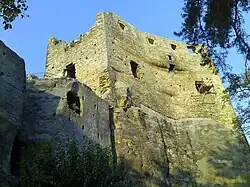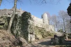 - 🌍 Valečov castle ruin. Nov–Feb: Sa-Su 10:00–17:00, Mar-Apr: Sa-Su and holidays 10:00–17:00; May, Sep: daily 09:00–17:00, Jul-Aug: daily 09:00–17:00. A wooden castle was built on the rocks by family of Valečov after 1300. It was burned down by Henry Wartenberg after Hussite wars in 1439. A stone palace was built in the first half of the 15th century, another floor was added in next century. The castle later served as administrative center and the nobility did not live here anymore, it was noticed as abandoned in 1652. Since 1994 the castle is owned by the municipality Bosen.
