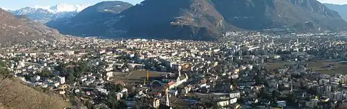 The city of Bolzano is in the Bolzano bowl at the confluence of three rivers (Talfer, Eisack, Adige) and extends about 6 km north to south and the same west to east and it's 3/4 surrounded by mountains. The historical centre is in the north-east in triangle formed by the Talfer in the west, the Eisack in the south-east and Mount Hörtenberg in the north-east. The modern areas (including the commercial and industrial area) are to the west and south. Most of the towns and villages of the metropolitan area are south of the city where the Bolzano bowl extends further. The River Adige flows through the westernmost suburbs.