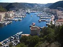Frequent ferries by Moby Lines and Blu Navy link the town with Santa Teresa Gallura in Sardinia. They take cars, and their schedule often allows for a day-trip in either direction. They provide an unforgettable approach to Bonifacio, negotiating the rocky Lavezzi Isles which mark the southernmost point of France, then steering in under the white cliffs. The ferry terminal is at the western edge of town at 🌍 Gare Maritime, Quai Sotta Portigliola.