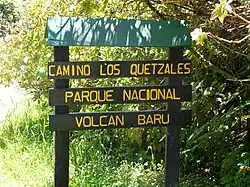 - 🌍 The Quetzal Trail (Feb 2024, closed for reconstruction) (Along the northern slopes of the volcano. From Volcan get off at the Bajo Grande junction beyond Cerro Punta.). Hike the Quetzal Trail, so named because it is one of the homes of the rare resplendent quetzal. You can hike from Boquete to Cerro Punta (4 hr one-way gradual elevation gain), or the reverse. Most hikers will hike from Boquete to the "Mirador Las Rocas" and then return to avoid the more than 3-hr return by bus from Cerro Punta back down through David, and then back to Boquete. It is about a 4-5 hr one way hike (8 hr out and back), so it can be completed in one day. Nevertheless, it is best to go from David to Cerro Punta, and from there hike to Boquete. Otherwise from Boquete to Cerro Punta you climb from 1,800 m to 2,500 m and back to 2,100 m (the range hut at the end). Also, walking from Cerro Punta, you might be even luckier, arriving late on the Boquete side when no guard is there anymore. The trail is perhaps the most famous hiking trail in all of Panama. Visitors come from all over the world to have an opportunity to see the Resplendent Quetzal. Although the trail is easy enough to hike by yourself, unless you are an experienced birder, it is difficult to spot a Quetzal, and a guide is almost necessary in helping to locate a nest. But between December and May you might be out of luck either way. Generally $5 on the Boquete side, but not charge consequently, maybe just during weekends.