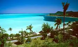 - 🌍 The St. Regis Bora Bora Resort, ☏ +689 40 607 888. Check-in: 15:00, check-out: 12:00. Every room (100 in all) is a suite with luxury bathroom. Many of the rooms are over-water villas, some with pools or spas. Over-water villas have glass panels in the floors and under-villa lighting to make the lagoon shimmer in your room. Guests are 80% American, 80% of whom are honeymooners. Nicole Kidman and Keith Urban honeymooned here. Two excellent restaurants on-site, one by Chef Jean Georges. The angle of the view on the main island is impressive.